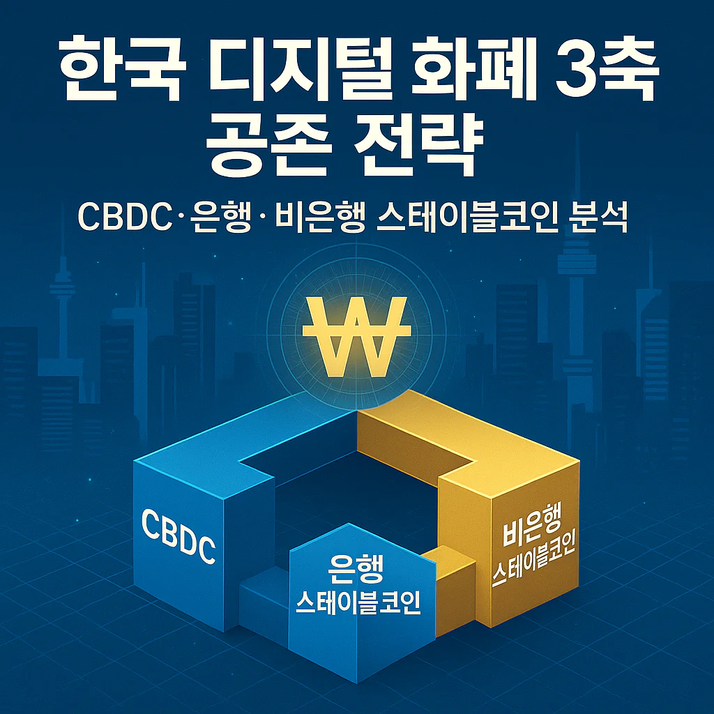 한국 디지털 통화 생태계는 중앙은행 디지털화폐(CBDC), 상업은행 발행 스테이블코인, 비은행 발행 스테이블코인이라는 세 개 축으로 구성된다. CBDC는 거시경제 관리와 공공 결제 인프라 신뢰 유지에 중점을 두며, 상업은행 스테이블코인은 기존 금융제도의 디지털 전환을 촉진한다.